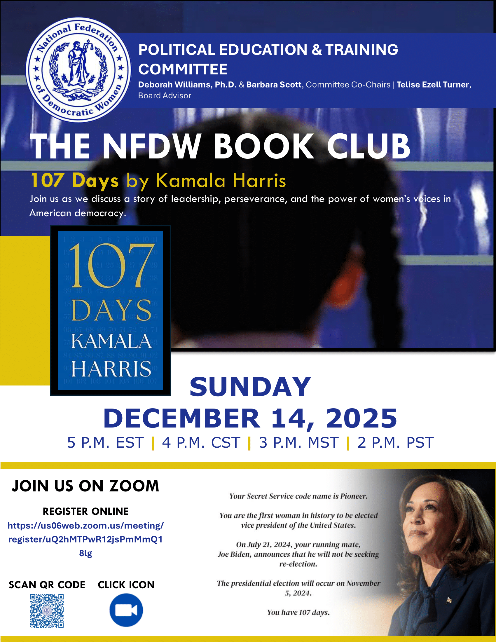 Join us for our first discussion on Sunday, December 14th at 5:00 p.m. EST via Zoom where we will begin with a powerful and timely read: Vice President Kamala Harris’s new book, 107 Days.